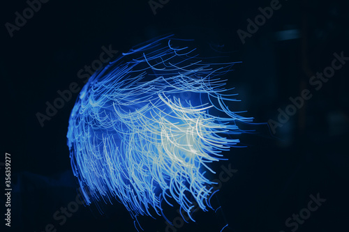 The watermark will not be included on Wall mural.: Blue abstract particles and lines with bokeh and blur in dark background