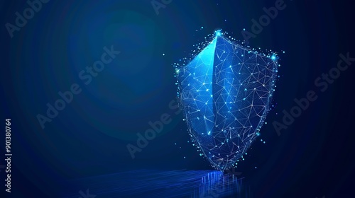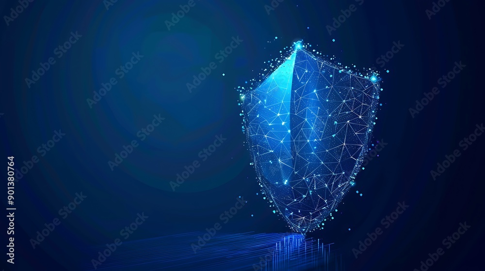 Wall mural : Blue abstract shield formed by glowing lines and dots representing digital security and protection -