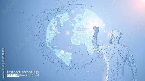 Wall mural : Blue abstract vector background - low poly wireframe contour of a man - man touches planet earth - a gr