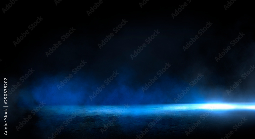 Wall mural : Blue dark background of empty foggy street with wet asphalt, illuminated by a searchlight, laser bea
