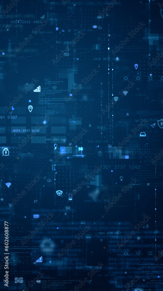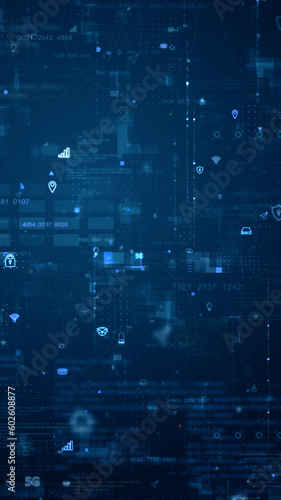 Wall mural blue data matrix simulation digital grid line and ai technology icon with futuristic hud screen on b