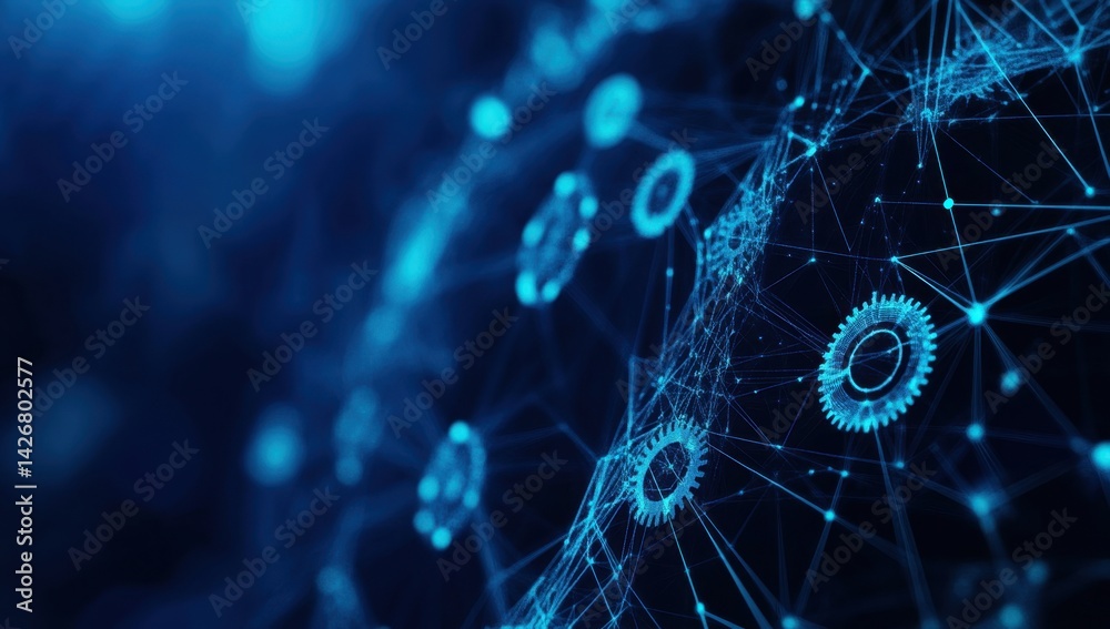 The watermark will not be included on Wall mural.: Blue digital background with gears and cogs in the foreground, representing technology and engineeri