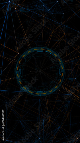 The watermark will not be included on Wall mural.: Blue digital circle futuristic hud elements and orange line connection on vertical abstract backgrou