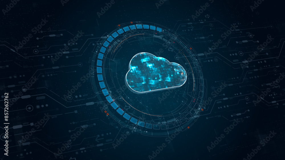 Wall mural blue digital cloud computing logo and circle futuristic hud elements with flowing arrows storage big
