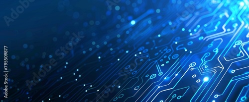 Wall mural : Blue digital technology background with a circuit board pattern and glowing dots on a dark blue back