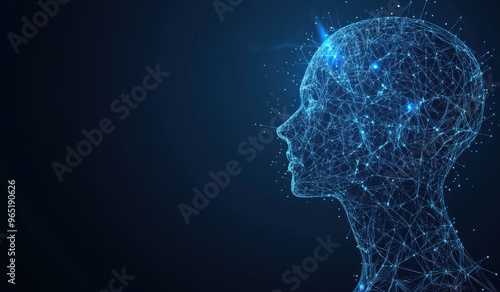 Blue digital wireframe hologram of human head representing artificial intelligence and future technoWall mural