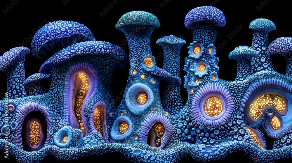 The watermark will not be included on Wall mural.: Blue fantasy structures on a black backdrop