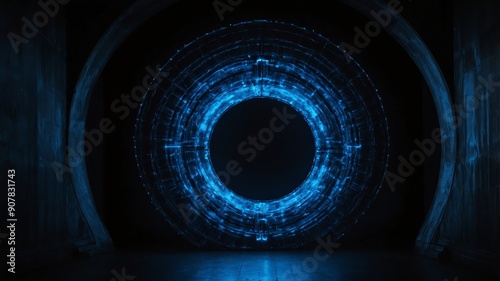 Wall mural : Blue glowing circle abstract in black background copy space design