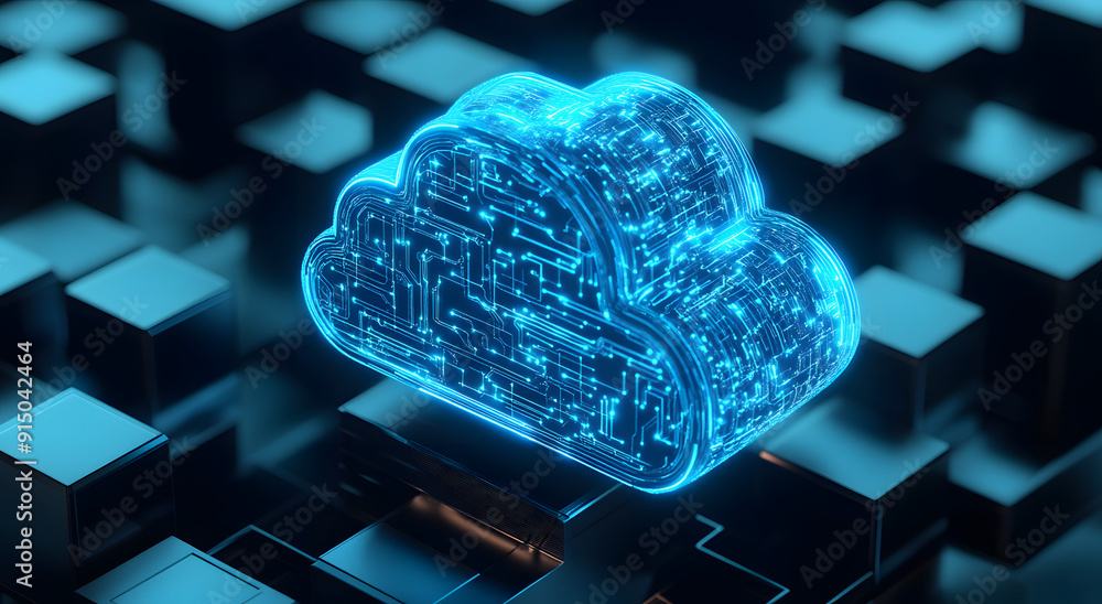 Wall mural Blue Glowing Data Cube Floating Over an Array of Digital Circuits