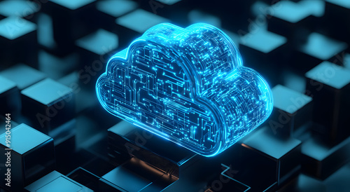 Wall mural : Blue Glowing Data Cube Floating Over an Array of Digital Circuits