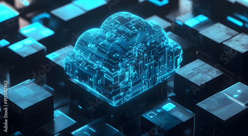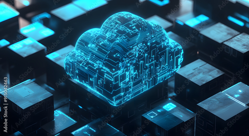 Wall mural Blue Glowing Data Cube Floating Over an Array of Digital Circuits