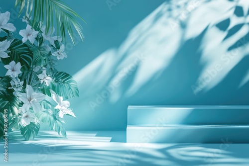 Wall mural : Blue gradient studio background with window shadows and foliage -