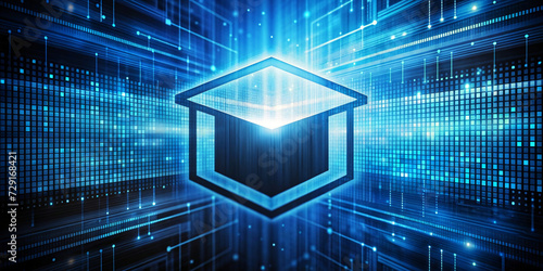 Wall mural : Blue icon of education background with binary code and futuristic technology design