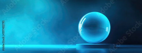 Wall mural : Blue illuminated glass sphere on a smooth surface with misty background and copy space for text -