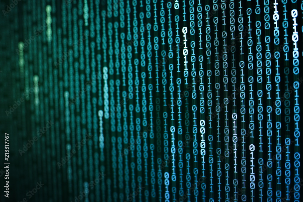 The watermark will not be included on Wall mural.: Blue led display screen showing one and zero number binary code data - internet information transfers