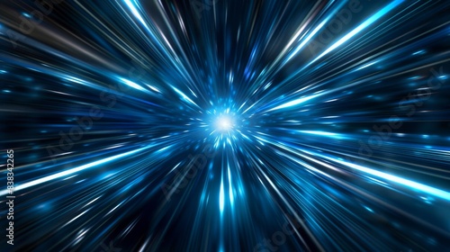 The watermark will not be included on Wall mural.: Blue light streaks converge in a dark void, creating a vibrant warp speed effect in a sci-fi scene -