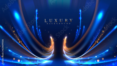 Wall mural blue luxury background with golden line decoration and curve light effect with bokeh elements. moder