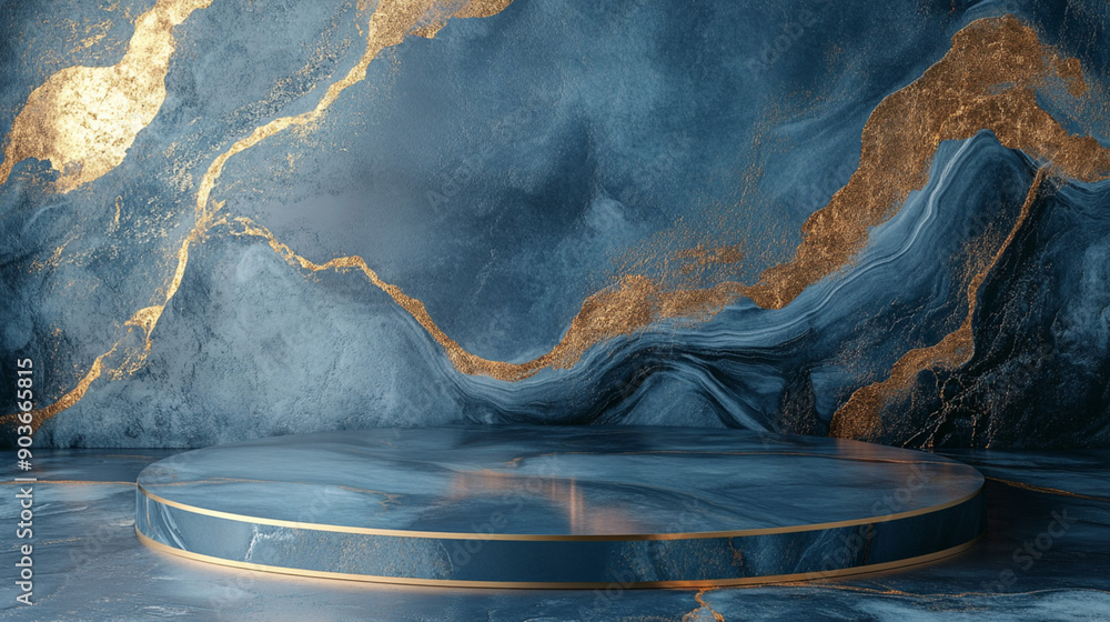 The watermark will not be included on Wall mural.: Blue marble and gold abstract background with generative ai - product display podium -