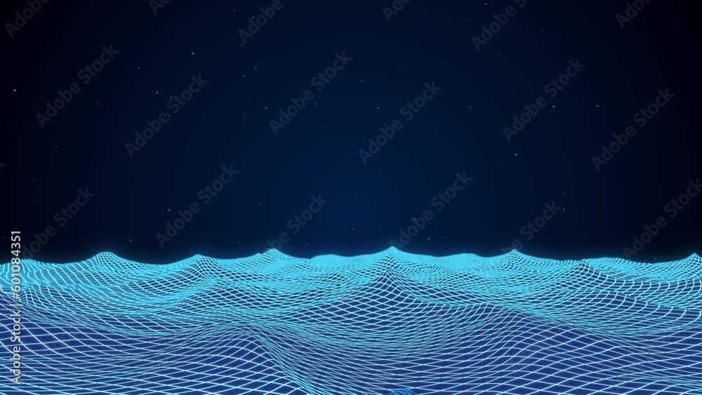 Wall mural : Blue neon grid wave animation background, futuristic wireframe terrain, 3d rendering abstract retro