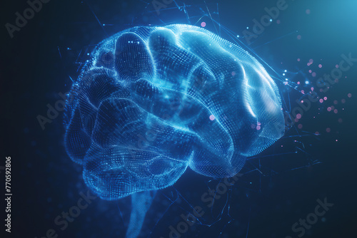 Wall mural blue neon human brain showing intelligent thinking, processing through the concept of a neural netwo
