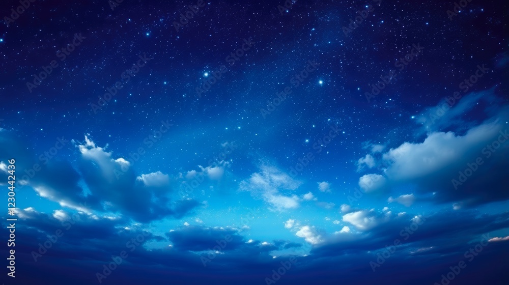 The watermark will not be included on Wall mural.: Blue night sky with milky way and stars - panoramic universe filled with noise and grain from long ex