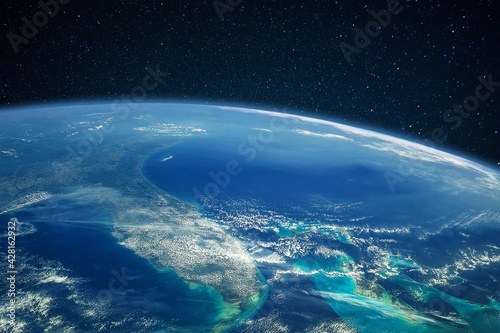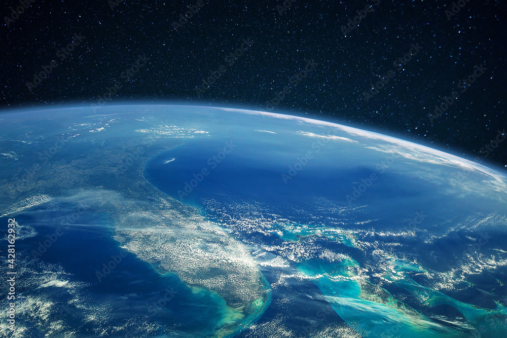 The watermark will not be included on Wall mural.: Blue planet earth with ocean and continents in open space on the starry sky