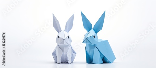 The watermark will not be included on Wall mural.: Blue rabbit origami on white backdrop with copy space image -