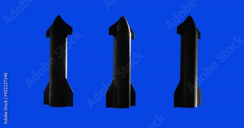 Wall mural blue screen modern spaceship rocket rotating isolated on blue background, illuminated by large light - Wall murals Wall mural blue screen modern spaceship rocket rotating isolated on blue background, illuminated by large light - Wall murals