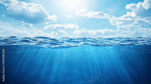 Wall mural blue sea or ocean water surface and underwater with sunny and cloudy sky: a split view featuring the