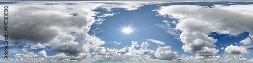 Wall mural blue sky hdri 360 panorama view with awesome white clouds with zenith for use in 3d graphics as sky