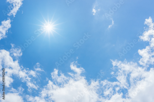 Wall mural blue sky with clouds and sun reflection. looking up view