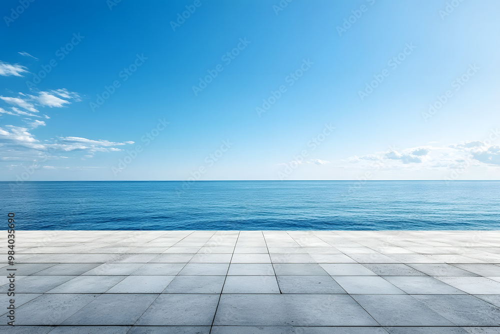 The watermark will not be included on Wall mural.: Blue sky with empty concrete floor and sea view - vibrant banner with space for copy - horizontal imag