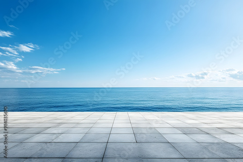 Wall mural blue sky with empty concrete floor and sea view. vibrant banner with space for copy. horizontal imag