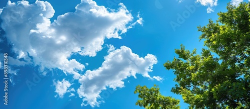 Wall mural blue sky with fluffy clouds providing a backdrop for a tree top with copy space image