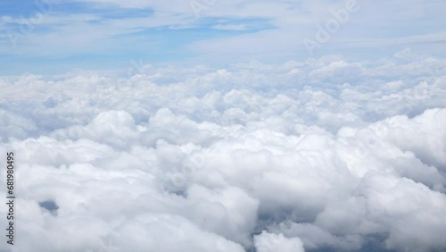 Wall mural blue sky with white fluffy clouds from airplane flight fly over the clouds in a sunny day with cloud