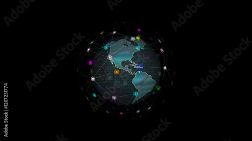 Wall mural blue technology icon and hexagon shape with earth sphere rotation on futuristic abstract background  - Wall murals Wall mural blue technology icon and hexagon shape with earth sphere rotation on futuristic abstract background - Wall murals