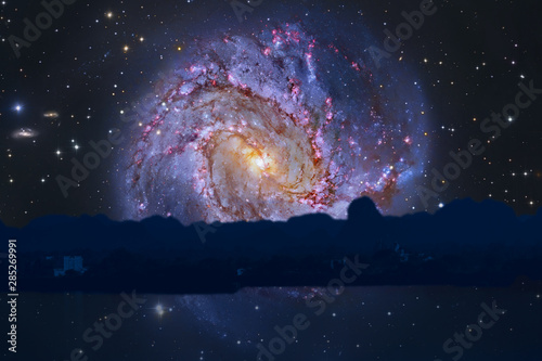 Blur nebula and galaxy back on night sky silhouette mountain and lake reflectionWall mural