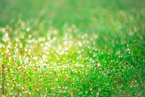 Wall mural blurred background of fresh green grass with dew drops in morning. background of environment. field