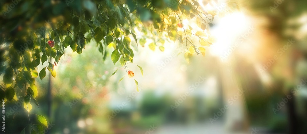 Blurred image of sunlight filtering through the leaves of trees in the yard - with copy space image - Wall mural