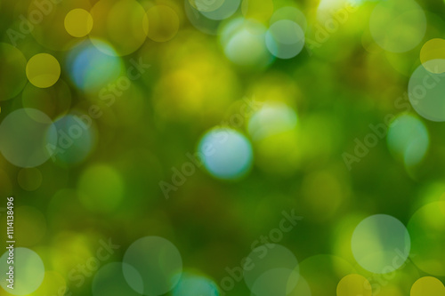 Wall mural blurred natural green background of tree foliage with round large blurred points of light in blue, y