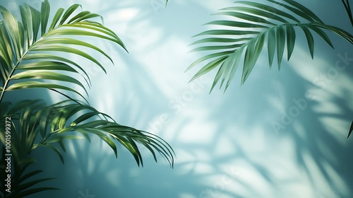 Wall mural blurred shadow from palm leaves on the light blue wall minimal abstract background for product prese - Wall murals Wall mural blurred shadow from palm leaves on the light blue wall minimal abstract background for product prese - Wall murals