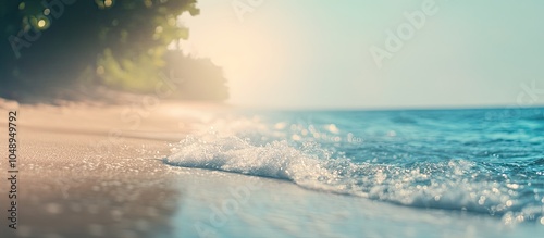 Wall mural blurred tropical beach with bokeh sunlight and waves creating an abstract background copy space for