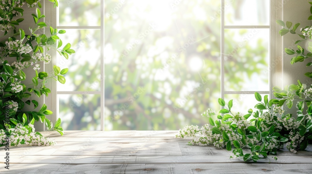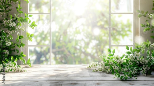 The watermark will not be included on Wall mural.: Board with empty space decorated with green flowers blurred white window and area for creating morni