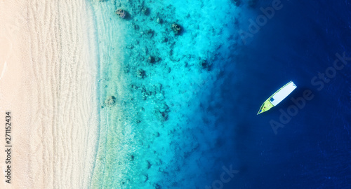 Wall mural boat on the water surface from top view. turquoise water background from top view. summer seascape f