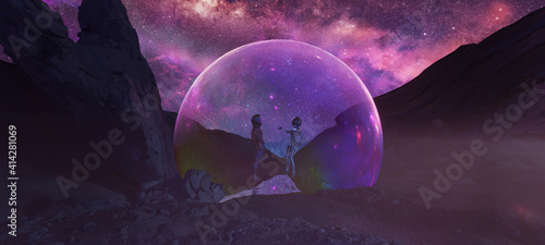 Wall mural : Bodyflying astronauts on alien rocky planet without enough gravity with glowing portal bubble on bac