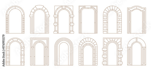 The watermark will not be included on Wall mural.: Boho arch door frames with vector line casing borders of minimal art ornaments - retro archways with