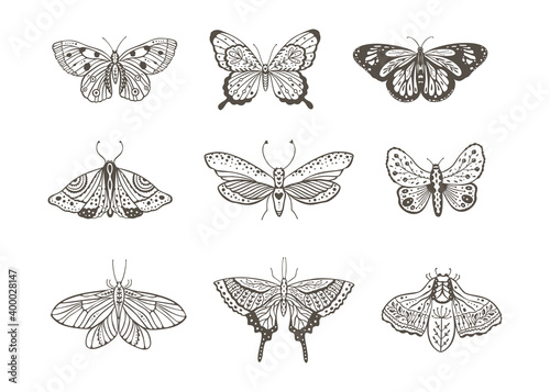 The watermark will not be included on Wall mural.: Boho vintage vector art design with bohemian butterfly - isolated insect icon set in simple style, ha