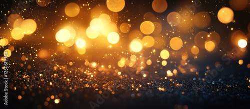 Wall mural bokeh lights effect background with glittering particles and space for text overlay in golden and bl