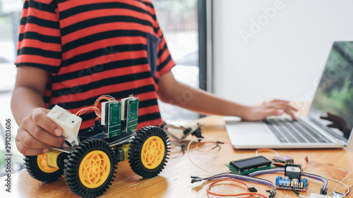 The watermark will not be included on Wall mural.: Boy with tablet pc computer programming electric toys and building robots -