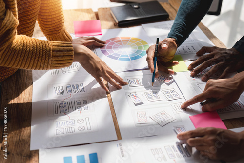 The watermark will not be included on Wall mural.: Brainstorm team of creative web graphic designer planning, group of asian mobile phone app developer